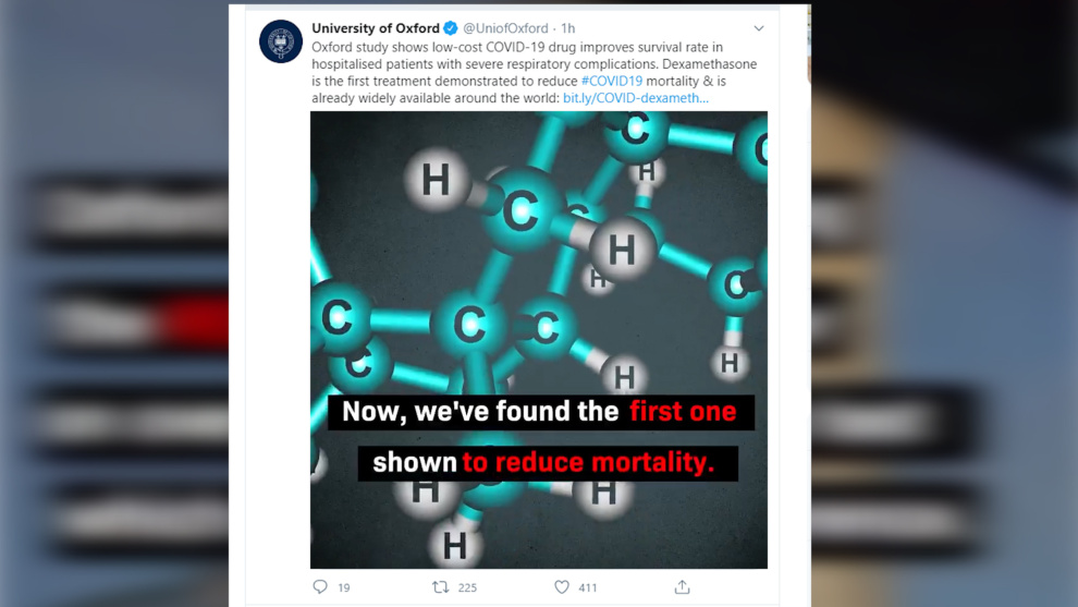 Un estudio de la Universidad de Oxford ha concluido que el uso de dexametasona, un fármaco ya aprobado y de bajo coste, reduce la mortalidad hasta en un tercio en pacientes hospitalizados con complicaciones respiratorias graves de COVID-19 que necesitan ventilación mecánica.