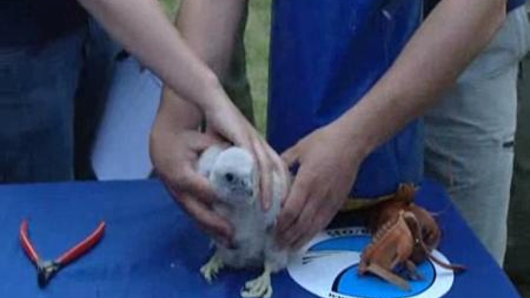 Cinco guardas forestales perfectamente coordinados han bajado de su nido a dos nuevos polluelos de halcón peregrino para proceder a su identificación mediante anillas. Los agentes han esperado a que Colón y América, los padres de los polluelos, abandonaran el nido para ir a cazar y en ese momento han aprovechado para bajarlos del nido que tienen en la torre del museo de América de Madrid. Los nuevos halcones han pesado 700 gramos y contribuirán a la conservación de esta especie amenzada en la comunidad de Madrid. En la actualidad hay seis parejas en la ciudad. Una cámara instalada en la torre permite ver a esta peculiar familia y así los agentes pueder observar todos sus pasos. Los polluelos han sido anillados y devueltos a su nido para que crezcan junto a sus padres hasta que sean adultos y puedan cazar por sí solos.