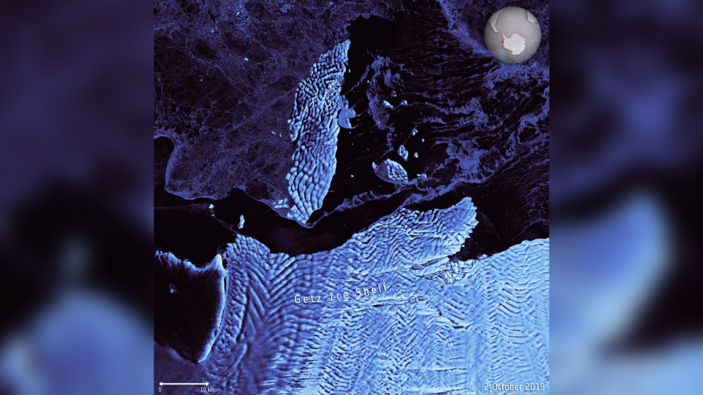 Utilizando imágenes de la misión Copernicus Sentinel-1 del 2 de septiembre al 14 de octubre de 2019, esta animación muestra la ruptura del iceberg antes de girar en el Mar de Amundsen.