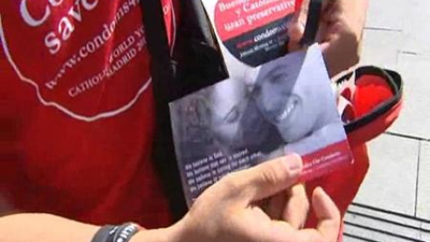 Una ONG de jóvenes está repartiendo información sobre el uso del preservativo en el centro de Madrid. Son sólo pulseras y pegatinas, no preservativos, pero la iniciativa no deja indiferente a nadie. Algunos de los peregrinos ven bien la distribución de la información. Sin embargo, hay quienes, molestos, dicen que a los católicos no les hacen falta ya que lo más importante es "la castidad".