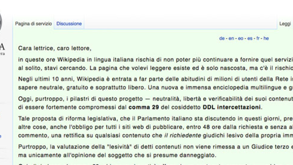 "Querida lectora, querido lector, en estos momentos Wikipedia en lengua italiana corre el riesgo de no poder continuar ofreciendo el servicio que durante estos años te ha dado. La página que querías leer existe y está sólo escondida, pero puede que dentro de poco estemos obligados a cancelarla de verdad". Desde hace dos días, con un fondo verde poco habitual, la página de Wikipedia en Italia ha bloqueado sus servicios y recibe a sus visitantes con un extenso comunicado-protesta contra la conocida como Ley mordaza.