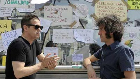 La Acampada Sol amaneció el pasado lunes fuera del foco mediático que la llevó días antes a la portada de The Washington Post. Las elecciones se llevaron el 15-M por delante, pero bajo esos toldos precarios y aprovechando las sombras de las calles aledañas a la Puerta del Sol se mantenía una intensa actividad. A primera hora de la tarde, el escritor Carlos Pardo (Madrid, 1975) y el músico Santiago Auserón (Zaragoza, 1954) se encontraron en la rebautizada como Plaza de la Solución para reflexionar sobre la oleada de protestas que han sacudido España. Pardo participó en una de las primeras asambleas, dos días después del 15-M, y fue uno de los encargados de redactar un primer esbozo de manifiesto con las reivindicaciones de los acampados. Auserón ha seguido de cerca la evolución de las protestas en los medios de comunicación y en sus visitas a la Puerta del Sol, donde acude para "escuchar y aprender".