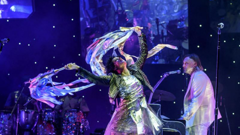 Arcade Fire ha ofrecido todo un despliegue instrumental, con una docena de músicos en el escenario, en un poderoso directo que no ha podido apagar ni la fina lluvia caída sobre el recinto, que ha quedado cubierto por la niebla bien entrada la noche.