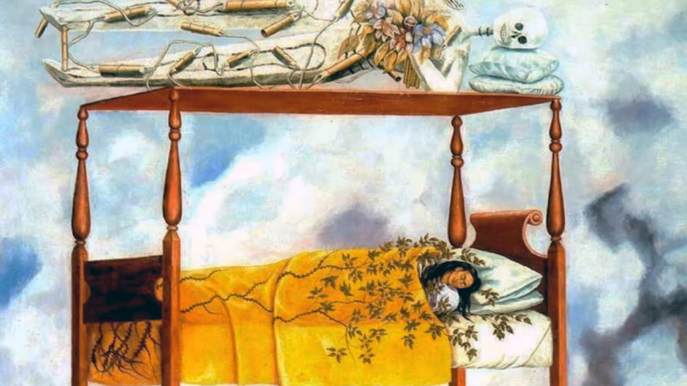El cuadro, llamado El sueño (La cama), retrata a Kahlo durmiendo, cubierta de ramas de árbol, en una cama que flota entre las nubes, y sobre la estructura de esa cama está tumbado un gran esqueleto con un ramo de flores en la mano y rodeado de dinamita.