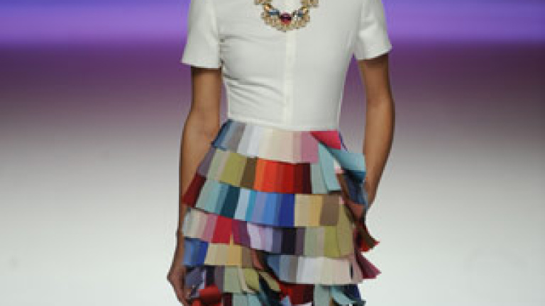David DelfínEl diseñador malagueño se ha vuelto más optimista en ‘Katharsis', una colección en la que no hay un color imaginable que no aparezca. ¿El motivo? Ha robado la idea de los muestrarios de paletas de color y los ha incorporado a sus vestidos, incluso los ha maximizado creando faldas completas.