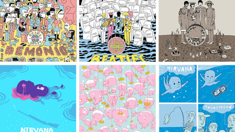 Ilustradores melómanos interpretan las portadas de discos más icónicas de la música pop, de Nirvana a The Beatles.