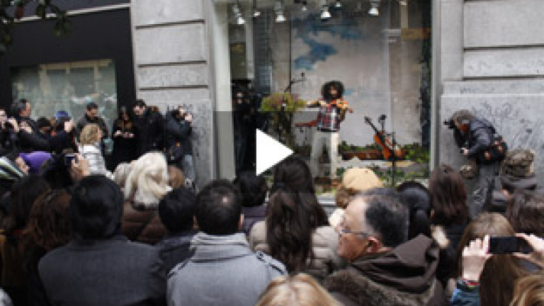 El violinista libanés Ara Malikian ha dado un pequeño concierto desde el escaparate de una conocida tienda de ropa en la Gran Vía de Madrid. Entre varios curiosos, el artista que ha tocado en las más prestigiosas salas de concierto del mundo en más de cuarenta países, promocionaba la nueva temporada primavera-verano de Cortefiel, interpretando las Cuatro Estaciones de Vivialdi.