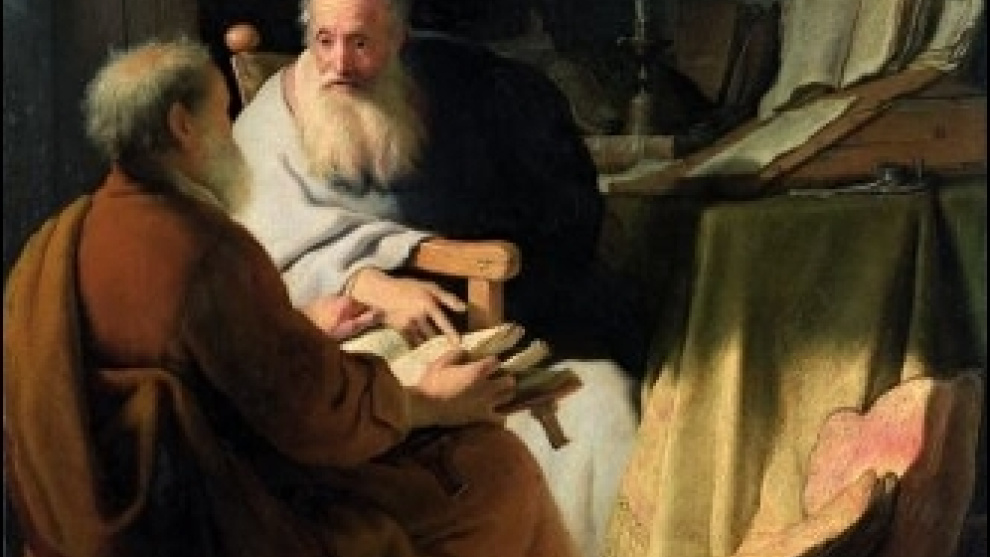 El enigma de la luzLa exposición del Prado, compuesta por 40 obras del pintor y seis de Tiziano, Rubens, Velázquez y Veronés, que sirven de contexto, incluye cuadros como La discusión entre San Pedro y San Pablo (1628), en la que una luz misteriosa se abre paso entre tinieblas para dar un aspecto enigmático al conjunto. Como explican Vergara y Teresa Posada en el catálogo de la exposición, el cuadro, cuya reproducción abre este artículo, muestra a dos ancianos sentados que discuten, uno con un gran libro en las rodillas, sobre el que incide... ¿la luz del sol?. Junto a un atril hay una vela apagada, que debía iluminar esa parte de la estancia antes de que el personaje dejase de escribir. La luz dirige nuestra mirada hacia él y hacia el gesto de su mano, que señala un libro cuyo contenido podría guiar la discusión que contemplamos (en teoría, la defensa de la fe en Cristo por encima de la obediencia a la ley judía, como se narra en la epístola de san Pablo a los Gálatas).