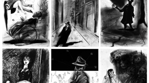 La obra ha sido ilustrada a carboncillo con imágenes tenebrosas