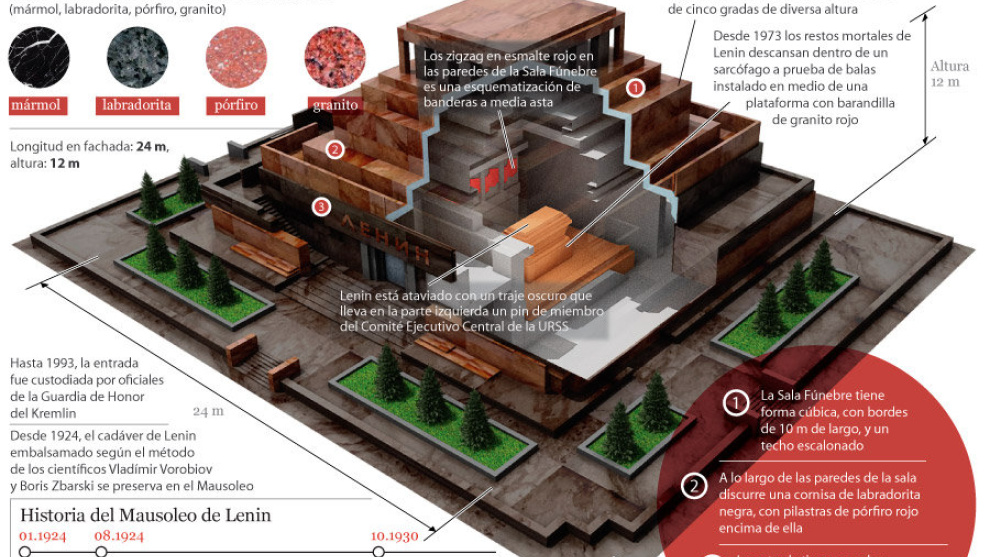 En el edificio se preserva el cuerpo embalsamado del fundador de la URSS, según el método de los científicos Vladímir Vorobiov y Borís Zbarski.
