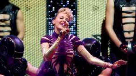 De ahí lo visto en el Palacio de Bercy. ¡Cómo estaba el patio! Un público compuesto a partes iguales por lo más modosito de la comunidad gay del centro de París y lo más encendido de la juventud arrabalera proleta festejó a sus anchas el intento de la australiana por rescatar sonoridades de los años ochenta, personajes de cómic norteamericano de los cincuenta e iconologías de geishas tradicionales, pasadas por el turmix de la imagen electrónica.