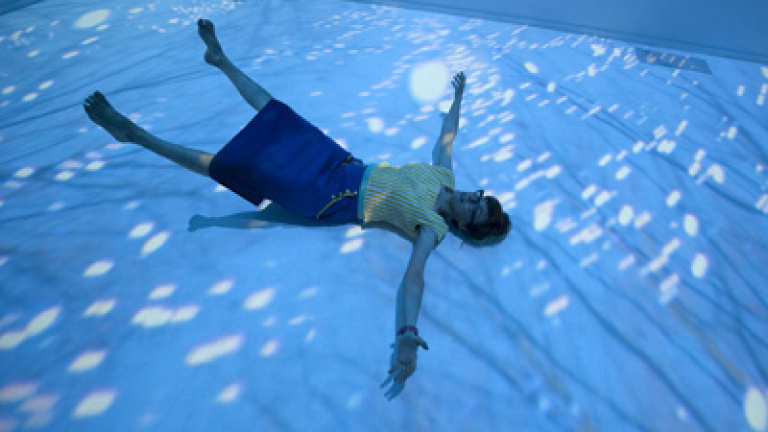 Un recorrido sin vergüenzaLa artista ha aprovechado la sinuosidad del edificio construido por Josep Lluís Sert para potenciar la experiencia libre y poética que desprende la exposición. Tras cruzar unos cortinajes de gasa, el primer impacto lo sirve la instalación Sip my Ocean (1996): las imágenes de dos cuerpos buceando en el mar invaden las paredes de la sala, el Wicked Game de Chris Isaak interpretado por la propia Rist suena a un volumen suave, y una moqueta mullida de color azul invita a tumbarse en el suelo. Dentro de esta peculiar pecera empieza el juego.