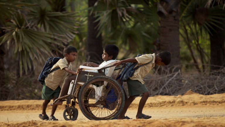 El caso de Samuel es impresionante. Bebé prematuro, nació con una discapacidad y no puede caminar. De una familia pobre del Golfo de Bengala, vive en una choza sin agua ni electricidad. Para llegar a la escuela, sus dos hermanos menores empujan varios kilómetros una silla de ruedas fabricada con desechos que han ido encontrando. Samuel quiere ser médico y ayudar a los niños como él.