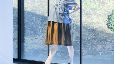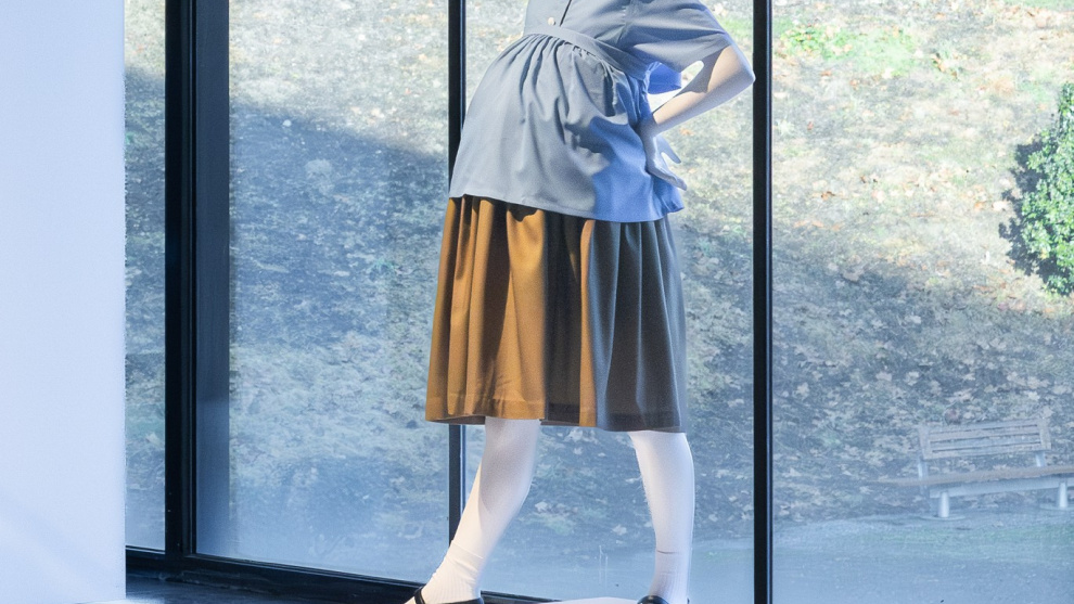 A simple vista, las prendas que cuelgan del perchero apenas se diferencian por algún pequeño adorno, pero Javier Martín-Jiménez subraya la intención del artista, quien "ha adaptado los uniformes escolares a los cambios corporales de esa niña embarazada".