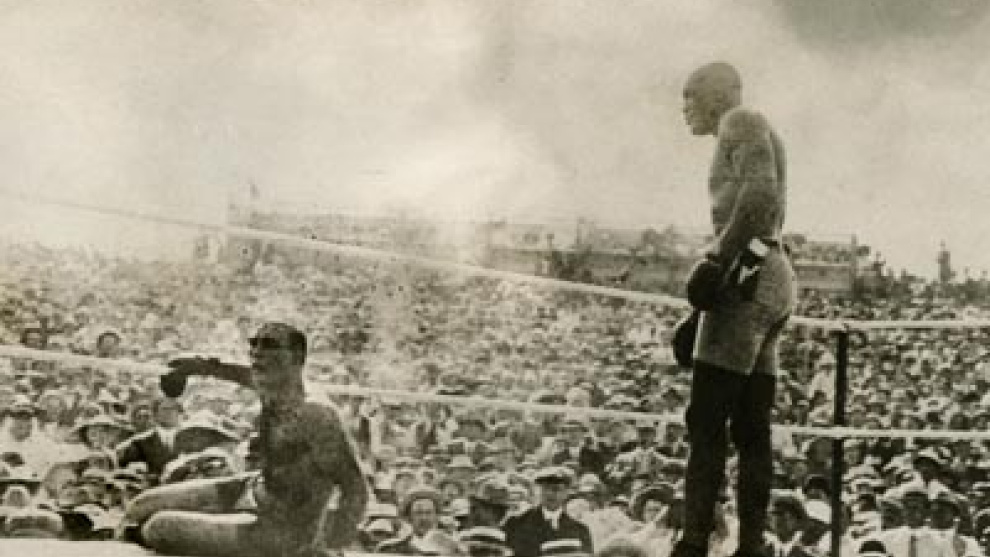 Un izquierdazo con la fuerza de un terremoto. El puño negro de Jack Johnson no sólo tumbó en el decimoquinto asalto a "la gran esperanza blanca", Jim Jeffries, sino que dejó sonado a todo un país. Jack Johnson retuvo su título de campeón de los pesos pesados el 4 de julio de 1910. Y lo hizo sin perder la sonrisa.