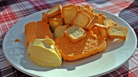 Déjalo enfriar a temperatura ambiente y cuando esté frío, desmóldalo. Utiliza un cuchillo, pinchando en los bordes para soltarlo. Pon una bandeja encima y lo giras. Puedes servir el pastel junto a unas tostadas.