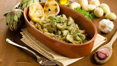 Las alcachofas guisadas con patatas son un plato muy mediterráneo, se comen en sus distintas versiones tanto en España como lugares como Cerdeña. El procedimiento es similar: se pelan las alcachofas, hasta dejar sus brotes más tiernos, y se guisan con agua o caldo y los tubérculos. En algunos lugares también le añaden costillas de cerdo.
