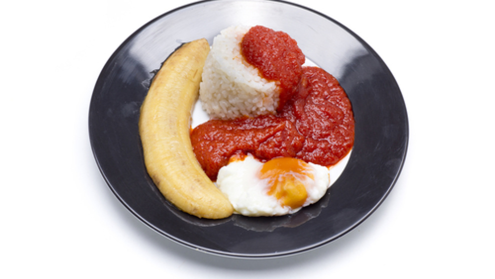 Pon el arroz dentro de una taza, vaso o molde. Llénalo y apriétalo con una cuchara. Después, vuélcalo en el plato intentando mantener su forma de torre. Pon el huevo frito por encima o al lado. Rodea el arroz con la salsa de tomate y los plátanos fritos.