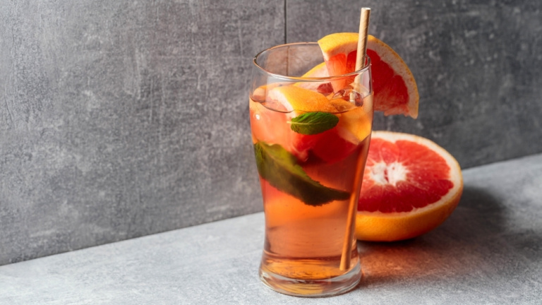 Adorna con una rodaja de pomelo y unas hojas de menta fresca.