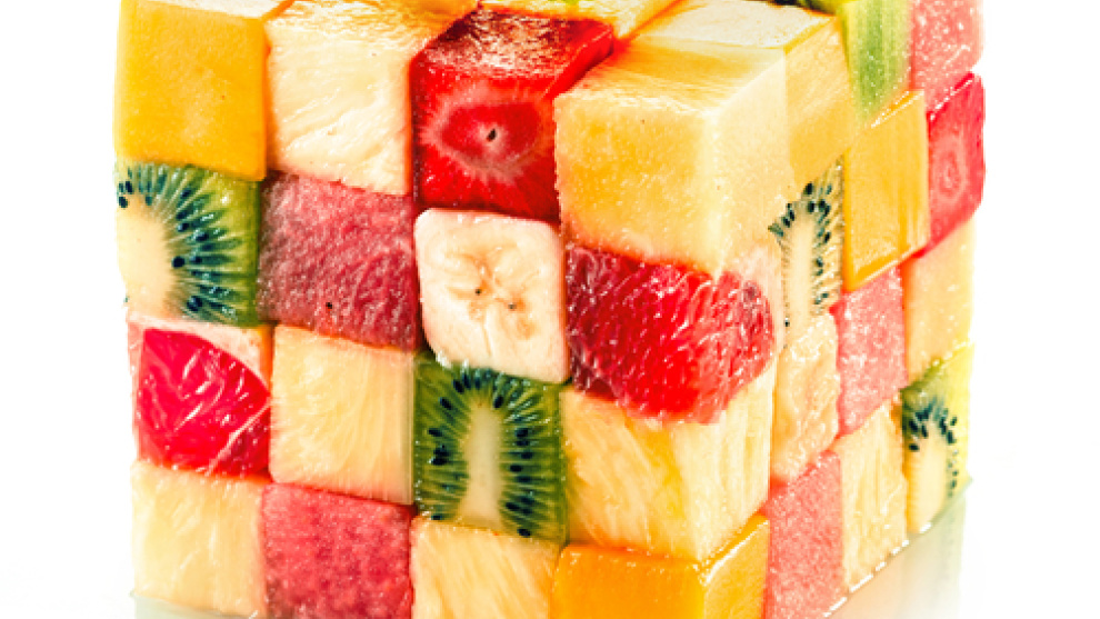 ¿Será esta la macedonia del siglo XXI? Frutas variadas cortadas en cuadrados o rectángulos y formando en su conjunto un divertido cubo de Rubik. Nada mal... Original, desde luego. ¿A quién no puede apetecerle?