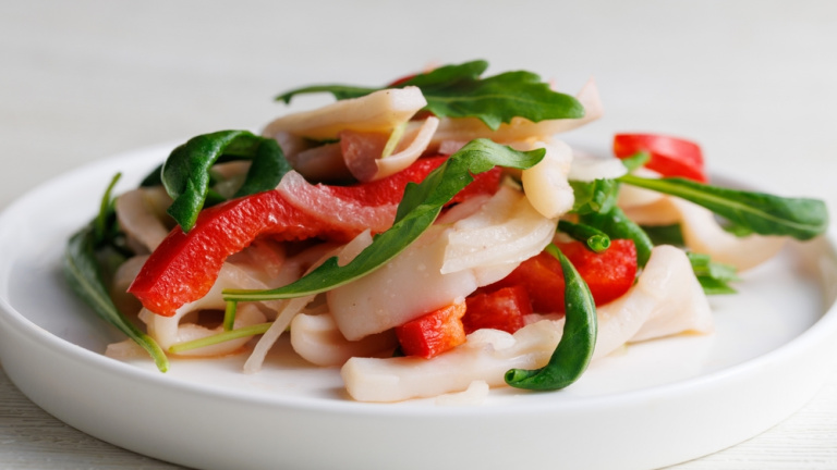 Se trata de una preparación sencilla, en la que solo tendrás que decidir si prefieres el calamar cocido en agua o salteado a la plancha (ambas versiones resultan deliciosas). Una vez hecho, se mezcla con vegetales crujientes como pimientos verdes y rojos, y se rocía con una vinagreta sabrosa en la que destaca el perejil. Si quieres darle un toque más verde, siempre puedes añadir rúcula o brotes tiernos.