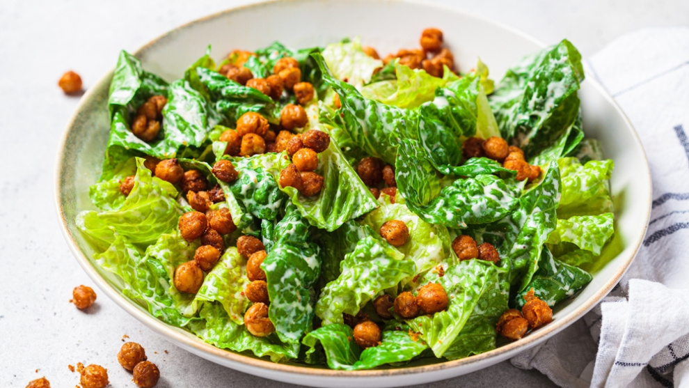 Si la César tradicional se reconoce por llevar pollo a la plancha o cocido, su alternativa vegana opta por garbanzos fritos salteados con especias. Y no es el único cambio en esta receta: la salsa, que mantiene su característico color blanco, no se elabora con mayonesa, sino con una crema de anacardos, ajo y agua.
