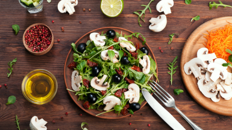 La ensalada de champiñones con tomates secos puede aportar en este sentido. Introduces setas, tomates, fibra y nutrientes. Le añades siempre algo de verde, y está exquisita. Puedes pasar por la plancha los champiñones o macerarlos como te enseñamos a continuación. Algo así como hacer un ceviche de setas, que aportará ácido y curará un poco la seta cruda.