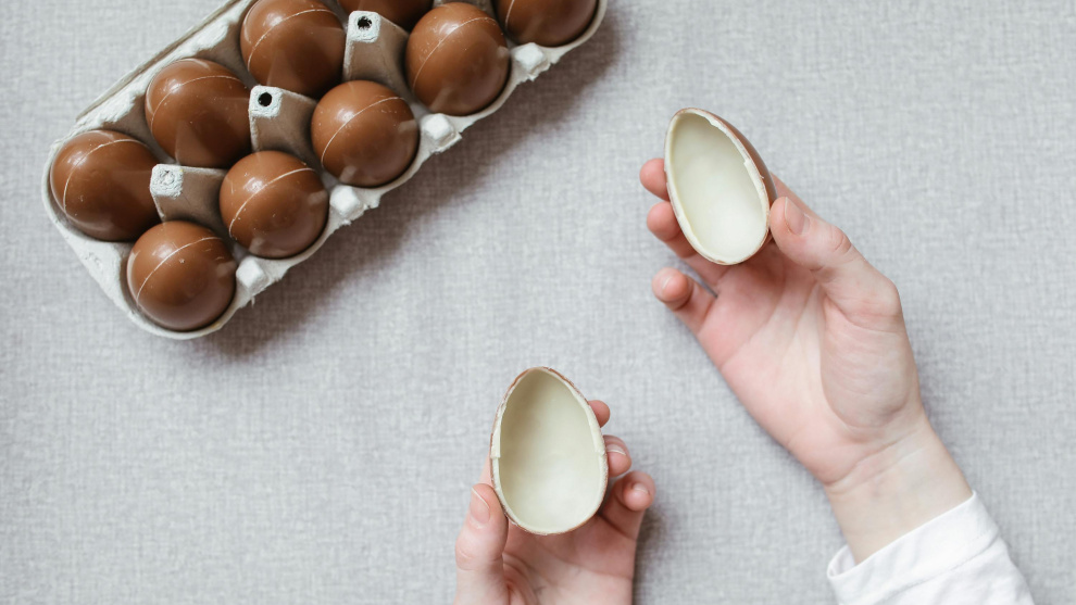 Los huevos de chocolate son una tradición en muchos países y un postre divertido para preparar con los niños. Se hacen con moldes de silicona o de plástico rígido, que se rellenan con chocolate templado hasta formar el huevo, un proceso que se realiza capa por capa, poco a poco. Lo ideal es usar chocolate para fundir, de buena calidad. Una vez templado, se van formando las capas, dejándolas enfriar entre una y otra, hasta que el cascarón tenga la consistencia adecuada.