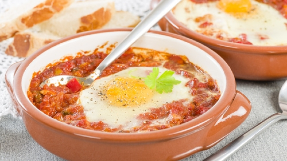 Se trata de hacer un buen sofrito con las verduras que decidas añadir. En muchas recetas se incluye, por ejemplo, patatas o pimientos rojos, que se fríen previamente cortados en dados. Puedes incluir la cantidad que quieras, pero es de agradecer que vaya bien cargado de vegetales y que estén bien repartidos por el lecho. Después se unen los ingredientes a la salsa de tomate frito, que es la base y debe cubrir todo el plato. Se le echa por encima el huevo, tras hacer en la salsa un hueco con una cuchara para que se integre bien. En el horno no tiene que estar más de 10 minutos o hasta que el huevo coagule. Esta receta también se puede hacer en sartén: sería entonces añadir los huevos a la salsa y esperar a que espesen a fuego medio.