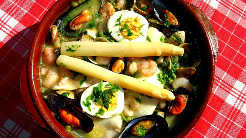 La merluza a la vasca es la cima o el pináculo maestro de ese zigurat de sabores que es el pescado en salsa verde. Si fuera una sinfonía, sería como añadirle nuevas capas o instrumentos. Toda una coreografía con el huevo duro, los guisantes y los espárragos blancos, que consigue un espectáculo visual y gustativo.