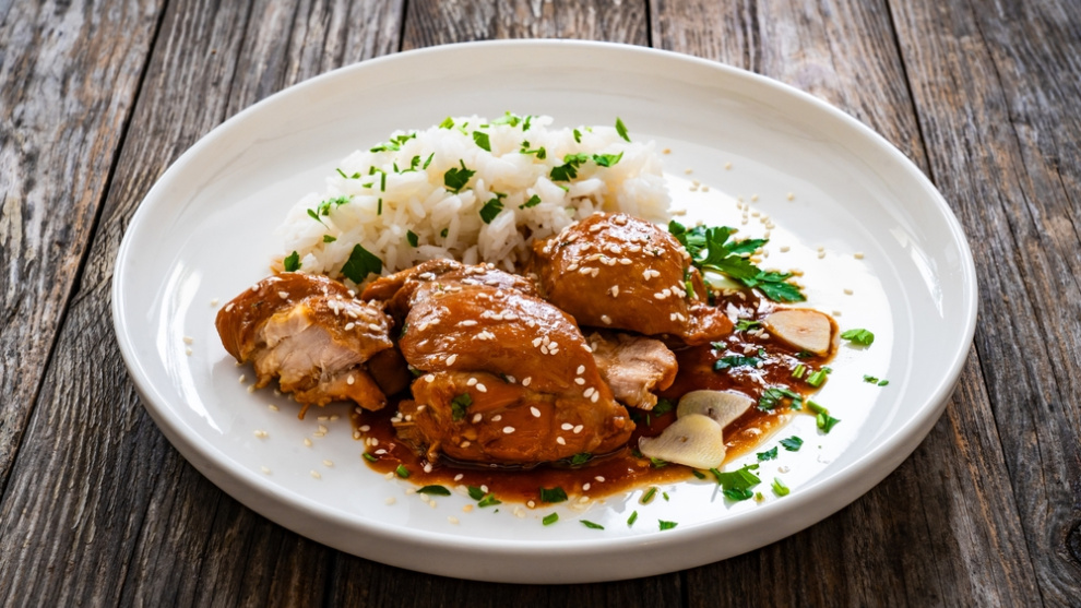 Es un plato sencillo de preparar, que se sirve con una salsa espesa (puedes reducirla o añadir un poco de maicena para espesarla). En realidad, se trata de una versión transoceánica del pollo teriyaki japonés y, al igual que éste, destaca por su sabor agridulce, gracias al azúcar moreno que se disuelve junto con la salsa de soja y el vino.