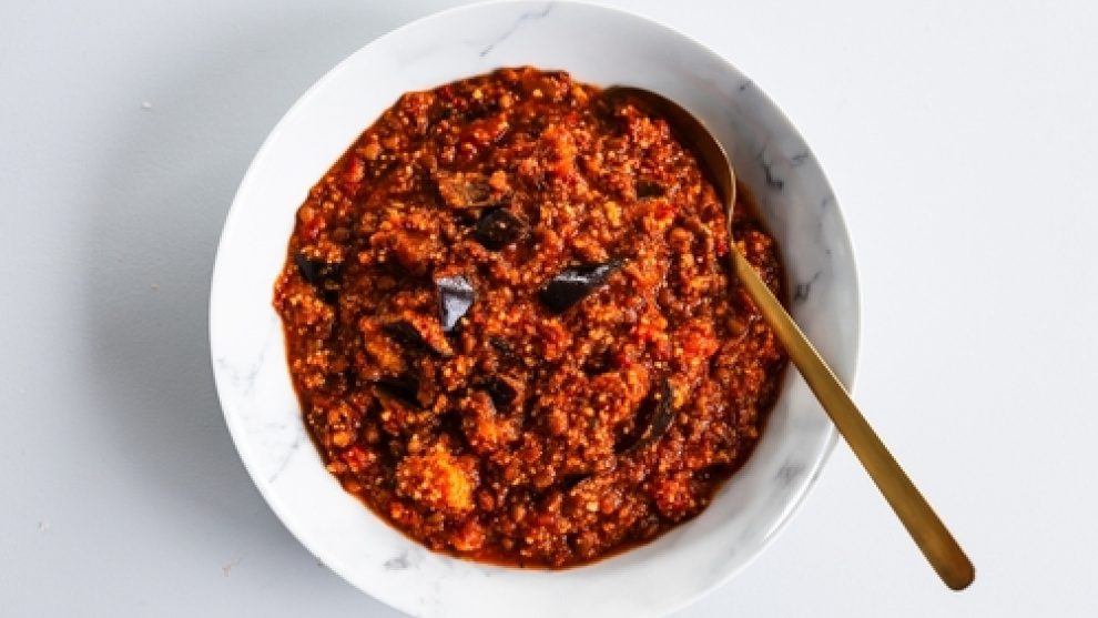 Una mezcla suculenta que se combina con el tomate frito y las especias, y que cuenta con otras hortalizas, como el pimiento rojo y la cebolla. Se cocina la berenjena directamente en la sartén o se asa al horno antes, junto con el pimiento rojo, para incluirse más tarde en el sofrito.