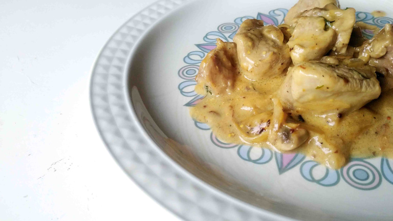 Echa una copita de coñac, brandy o whisky. Flambéalo con un mechero (vigila porque saldrá una llama potente, aparta líquidos inflamables, gatos y niños). Cuando las llamas comiencen a reducirse, remueve. Añade una cucharada y media de nata fresca y una cucharadita de mostaza de Dijon. Remueve y echa caldo de pollo (solo que cubra la carne hasta la mitad) y llévalo a ebullición. Añade pimienta negra y sal y deja que se cocine durante unos diez minutos. Debe reducirse la salsa, que salga densa. Comprueba el punto de sal. Deja que repose y sírvelo caliente.
