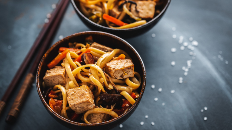 Antes de que los veganos se enamoraran del tofu, los asiáticos ya lo conocían, pues tuvieron a bien inventarlo. Han creado infinitas recetas con él, y una de las más sencillas son los tallarines con tofu al wok. Puedes usar una sartén en vez del wok, a condición de que cuando sofrías los tallarines esté muy caliente (toman su sabor por el aceite y las especias, pero vigila con el exceso de grasa).