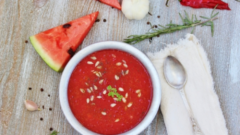 El gazpacho puede comportarse como un camaleón. Cambiar los colores y frutos. Sigue a los de su linaje, a las sopas frías, los bálsamos del verano que son capaces de modificar sus tonos y sabores al antojo. El gazpacho de sandía es solo una más de estas metamorfosis o sugerentes cambios. Y esto viene de antiguo. Los gazpachos que se citan en el Quijote, por ejemplo, no eran para nada rojos ni llevaban tomates (una hortaliza entonces recién llegada de América que, como les ocurre a muchos emigrantes, sufrió al principio el recelo de los nativos cristianos. La consideraban nada menos que venenosa).