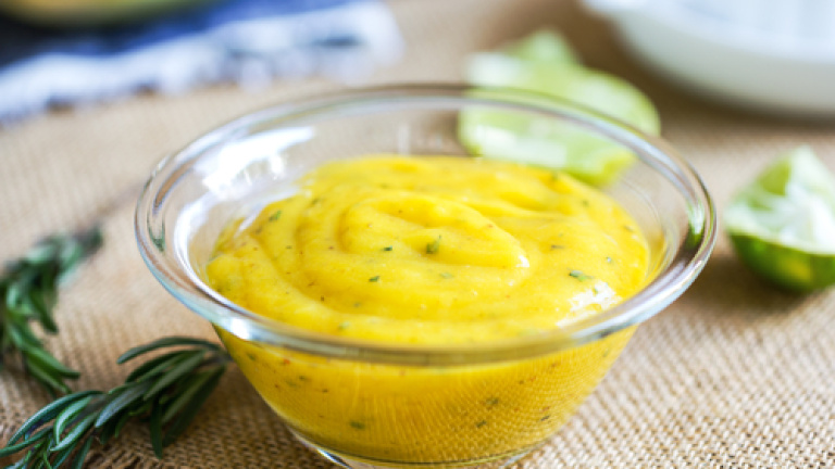 Es muy sencilla. Solo tienes que batir bien los trozos de la fruta pelada y conseguir que emulsione la salsa. Debes triturar primero el mango hasta dejarlo como si fuera un zumo. Después le agregas el aceite de oliva, poco a poco, dándole la consistencia que consideres necesaria. Algunos cocineros también le echan vinagre balsámico y una pizca de curry o de pimienta rosa.