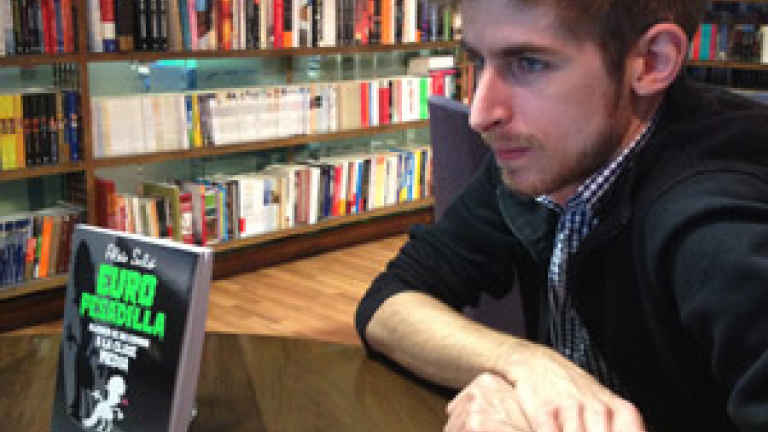 Posa ante los fotógrafos con la soltura de un actor y argumenta cada respuesta con la certeza de un avezado profesor de economía. El viñetista de moda, Aleix Saló (Ripollet, 1983), aquel joven que destripó con lucidez y agudeza la burbuja inmobiliaria con Españistán regresa ahora con Euro Pesadilla (Alguien se ha comido a la clase media), un nuevo volumen en el que con el desparpajo habitual se remonta a la Edad de Piedra para explicar los males que acucian a Europa.