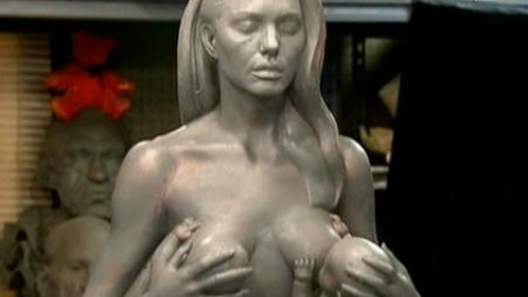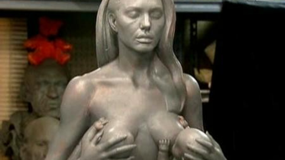 Daniel Edwards, un escultor estadounidense, está trabajando en una nueva escultura que muestra a Angelina Jolie dando el pecho a sus gemelos. La idea, según el propio Edwards, surgió cuando pensó en el rechazo que hay en la sociedad al ver a madres dar el pecho a sus hijos en lugares públicos. La inacabada escultura es de arcilla y bronce, está realizada casi a tamaño natural y será presentada el próximo viernes 11 de septiembre durante una inaguración simultánea en una galería en Norman, Oklahoma -cerca de donde nació Brad Pitt- y en Londres. Daniel Edwards, quién cree que a Angelina Jolie le hará gracia su escultura, ya tiene un proyecto en mente: Una estatua de la propia Jolie y su marido Brad Pitt compartiendo cama.