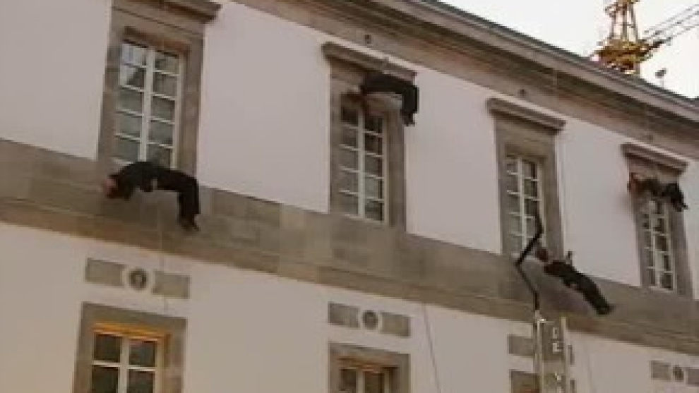 Un espectáculo insólito, fuera de lo común, en un espacio totalmente distinto de los escenarios habituales. Cinco bailarines de la Compañía de Carmen Werner danzaron sobre la fachada del MARCO (Museo de Arte Contemporáneo) de Vigo, en un plano vertical. La performance 'Los hombres también mueven paredes' está dentro de los eventos que el MARCO ha organizado con motivo de su quinto aniversario. Pero sin duda, el más espectacular ha sido esta danza tan peculiar sobre la fachada del Museo que también se repetirá mañana. Hoy, cientos de vigueses han podido disfrutar de algo poco habitual en la ciudad olívica.