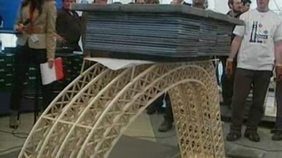 Siete puentes de todo tipo y diseño se han expuesto en Bilbao, pero lo importante más que su estética eran las carasterísticas técnicas de la construcción. Todos han demostrado su resistencia. Los puentes, elaborados con palillos de helados, tenían que soportar el peso de tantas losas como fueran capaces de aguantar. Los primeros puentes no tardaron en caer mientras que el ganador fue capaz de soportar la friolera de casi 600 kilos de peso en forma de losas, en concreto 592 kilos.