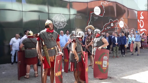Un 'escuadrón romano abre paso a la alcaldesa gijonesa en el stand del Ayuntamiento gijonés en la Fidma
