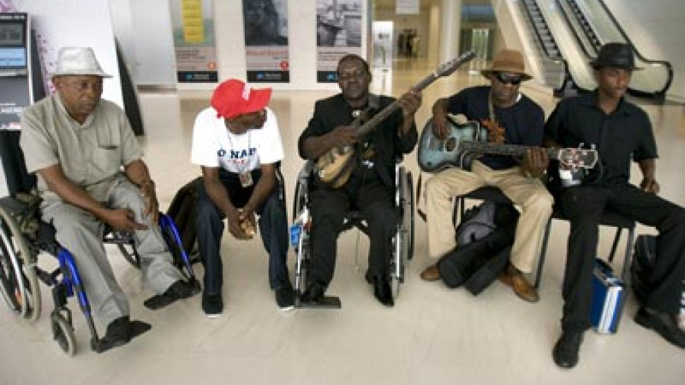 Más allá de las aparienciasContar el porqué de sus canciones no es su punto fuerte, por eso, tras una breve rueda de prensa, ofrecieron un concierto acústico en el vestíbulo del Caixaforum. Allí demostraron que si de algo son capaces, es de conseguir que el público se mueva. Desde su silla de ruedas, Ricky seguía con todo el cuerpo la música de la banda, que fusiona la rumba y el blues. Lejos de arrellanarse en la resignación o la mendicidad, los Benda Bilili apelan a la acción a través de sus instrumentos.