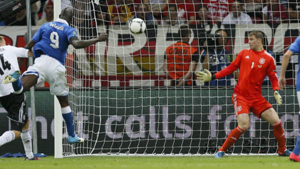 Min 18: ¡¡¡GOOOOOL DE ITALIAAAAA. BALOTELLIIIIII!!! El jugadón se lo marca Cassano, que se marcha de tres alemanes en un palmo de terreno y coloca un centro perfecto para el cabezazo de SuperMario, que le gana la partida a un lento Badstuber.