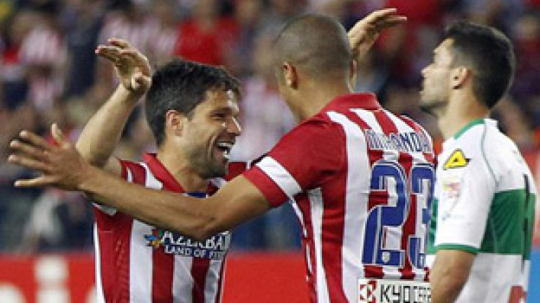 Una acción a balón parado, transformada por el brasileño Joao Miranda en el 1-0, sostuvo hoy la ventaja en la carrera por la Liga del Atlético de Madrid, que descontó a tres triunfos su distancia del título con un triunfo apurado, sentenciado en el último minuto con el 2-0 contra un Elche muy competitivo.