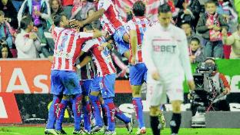 El Sporting, que llegaba tocado, se envalentonó con el gol de Sangoy. Aguantó las embestidas del Sevilla y su ritmo frenético, pero no se olvidó de la pelota. Cada vez que la agarró quiso jugar con ella para hacer daño. Ahí emergió la figura de Rivera para darle la salida más dañina hacia Castro, De las Cuevas o Carmelo. El canario se fue a la izquierda para darle una clase de baile de cintura a Konko. Un amague, un arranque y un centro al área. Allí estaba Diego Castro, sin más opción que el taconazo que dejó clavado a Palop. Carmelo se retiró del campo ovacionado, andando, como juega a veces, aunque maneja bien las aceleraciones en los últimos metros.