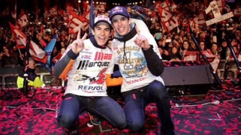 Los pilotos Repsol Honda y Estrella Galicia 0,0 compartieron una tarde noche inolvidable con miles de aficionados que quisieron festejar el hecho insólito en 66 años de historia del Mundial de motociclismo de ver a dos hermanos proclamarse campeones. Los pilotos fueron recibidos en el Ayuntamiento de Cervera. Ahí, los hermanos Márquez firmaron el Libro de Honor antes de salir a saludar a los aficionados congregados frente al consistorio.