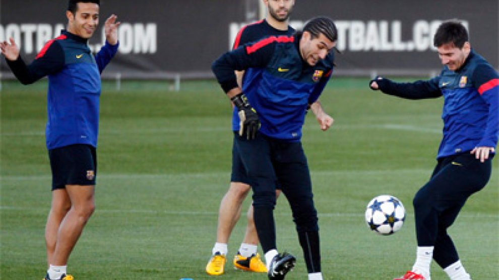 No parece que el Barça vuelva a jugar con un equipo plagado de 'peloteros' y Cesc seguramente no estará de inicio. En el resto de alineación no debe haber muchas sorpresas. Alves, Piqué, Puyol y Alba compondrán la defensa; Busquets, Xavi e Iniesta estarán en la zona de creación y Messi podría estar acompañado en ataque por Pedro, además del mencionado Alexis.