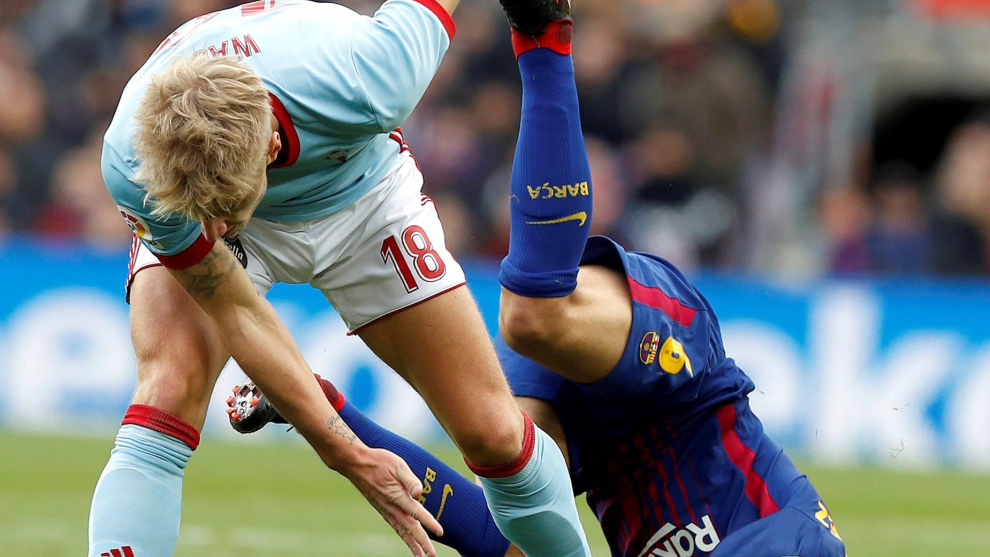 En los primeros minutos, el Celta de Vigo cumplió con lo dicho por su entrenador en la previa del encuentro e intentó discutirle al Barça la posesión, arrebatándosela por momentos. Sin embargo, fue a la contra como los gallegos se adelantaron en el luminoso; Iago Aspas mandó al fondo de la red el rechace de Ter Stegen, que había salvado en boca de gol el remate de Maxi Gómez a pase del propio Aspas.
