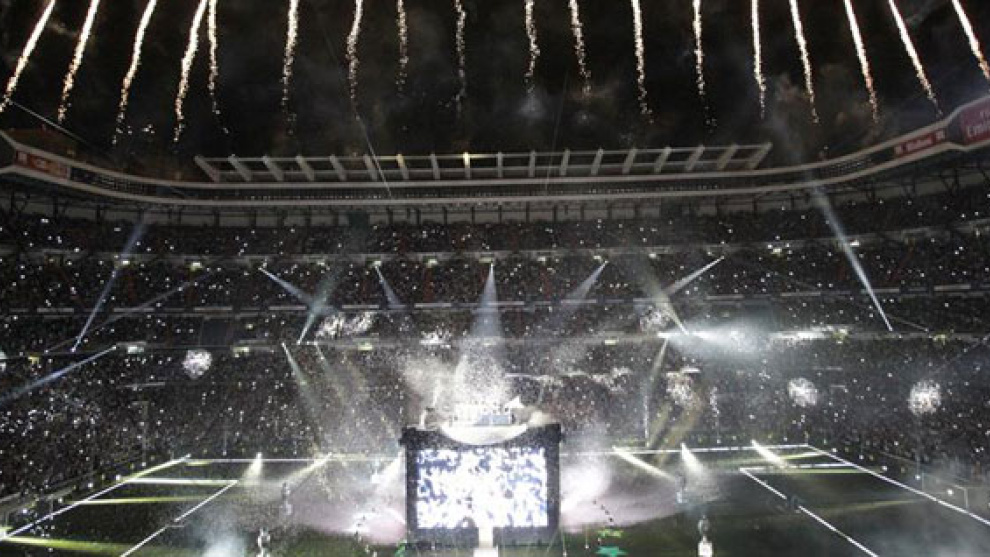 Alrededor del círculo central, una reproducción de cada una de las Copas de Europa logradas por la entidad blanca abrazaba la figura geométrica fija en el círculo central. El presentador y showman televisivo Miki Nadal fue el animador del acto, el agitador de un público que abarrotó las gradas del Bernabeu desde horas antes del inicio, que comenzó con casi sesenta minutos de retraso sobre el horario previsto.