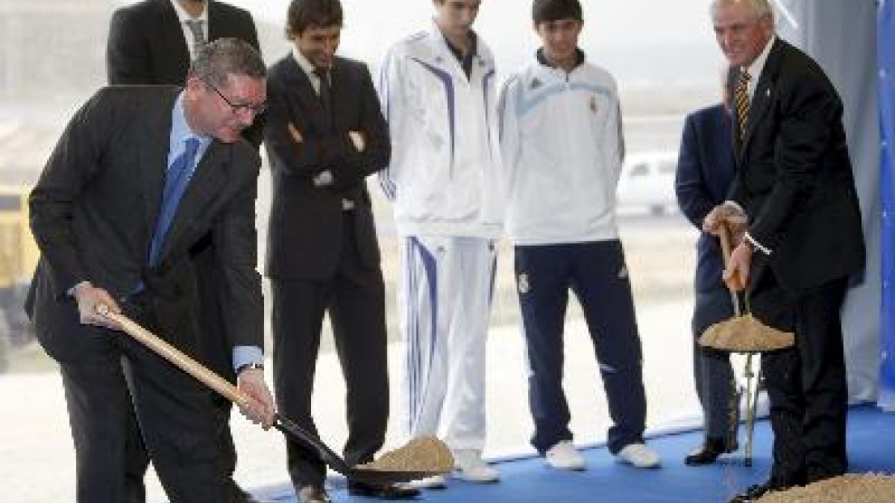 Ramón Calderón, presidente del Real Madrid, y Alberto Ruiz-Gallardón, alcalde de la ciudad, han puesto hoy la primera piedra en Valdebebas de la residencia que, bajo el lema "construyendo futuro", comienza a edificar la directiva del club, en cumplimiento de una de sus promesas electorales.